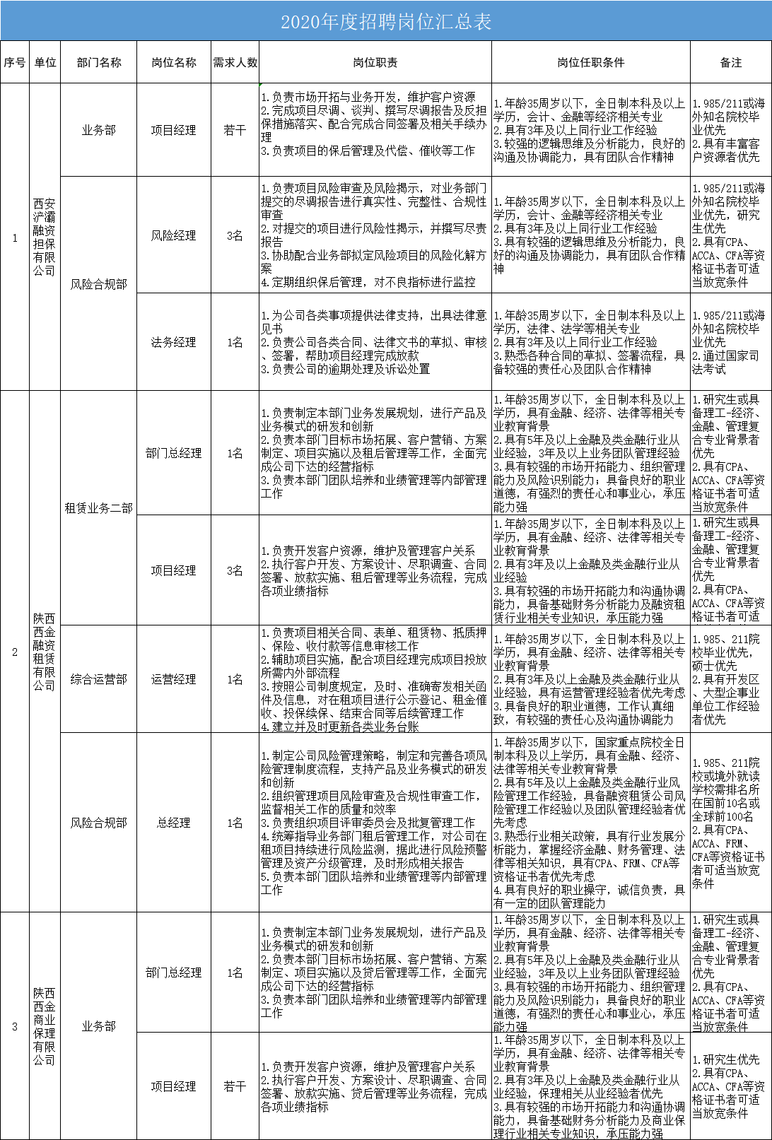 根據(jù)公司發(fā)展需要,按照公開、公平、公正、擇優(yōu)的原則,西安浐灞融資擔保有限公司、陜西西金融資租賃有限公司、陜西西金商業(yè)保理有限公司現(xiàn)面向社會招聘工作人員,招聘崗位詳見附件《2020年度招聘崗位匯總表》,具體如下: