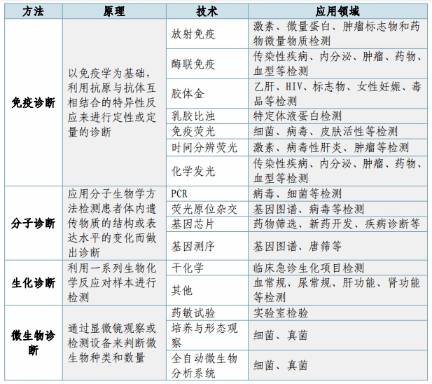 體外診斷按檢測(cè)原理主要可分為六大類。根據(jù)檢測(cè)原理和方法分類,體外診斷主要分為生化診斷、免疫診斷、分子診斷、血液和微生物診斷和POCT診斷等類別。不同診斷方法的檢測(cè)原理和技術(shù)手段不同,應(yīng)用領(lǐng)域也存在較大差異。目前國內(nèi)體外診斷市場(chǎng)規(guī)模占比最大的是免疫診斷、分子診斷和生化診斷三大類。