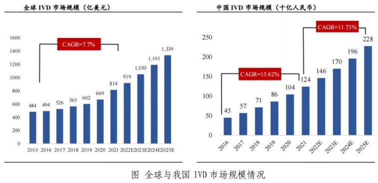 體外診斷是近年來醫(yī)療行業(yè)中發(fā)展最迅速、最活躍的子行業(yè)之一,目前在全球范圍內(nèi)已經(jīng)逐步成為規(guī)模顯著的成熟產(chǎn)業(yè)。隨著慢性病發(fā)病率增加及醫(yī)療技術(shù)和服務(wù)水平的提升,全球IVD市場(chǎng)規(guī)模預(yù)計(jì)在2025年將增長(zhǎng)至1339億美元,2022-2025E年復(fù)合增長(zhǎng)率約為9.9%,實(shí)現(xiàn)加速擴(kuò)張。