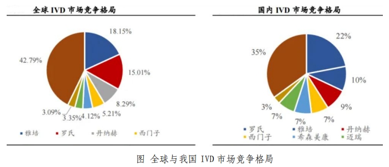 我國IVD市場(chǎng)格局同樣由進(jìn)口品牌主導(dǎo),CR5為 55%,前五名分別為羅氏、雅培、丹納赫、西門子和希森美康。市場(chǎng)份額領(lǐng)先的國產(chǎn)企業(yè)有邁瑞和安圖,二者份額之和僅占約10%,其他國內(nèi)廠家規(guī)模較小、市占率較低。外資企業(yè)憑借其中高端領(lǐng)域的技術(shù)優(yōu)勢(shì)以及在中高端領(lǐng)域的“儀器+試劑”一體化平臺(tái)壟斷市場(chǎng),但疫情帶來的診療需求及IVD集采的落地將促進(jìn)國內(nèi)IVD企業(yè)迅速發(fā)展,加速進(jìn)口替代,進(jìn)一步擴(kuò)大市場(chǎng)份額。