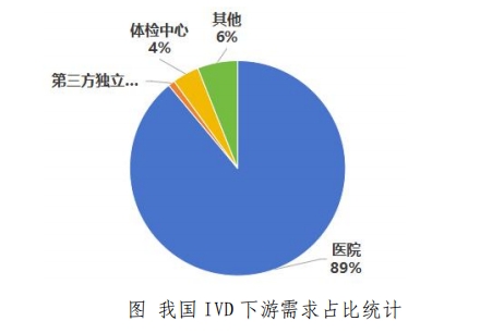 IVD產(chǎn)品通過直銷、經(jīng)銷渠道銷往醫(yī)院、政府和第三方檢測(cè)中心等下游客戶,目前以醫(yī)院為主,終端消費(fèi)群體為廣大患者及需要健康檢測(cè)的人群。其中,醫(yī)院是體外診斷行業(yè)最大的下游需求端,占總市場(chǎng)規(guī)模的89%,第三方獨(dú)立實(shí)驗(yàn)室占比約1%,體檢中心市場(chǎng)占比4%,其他領(lǐng)域需求占比6%。