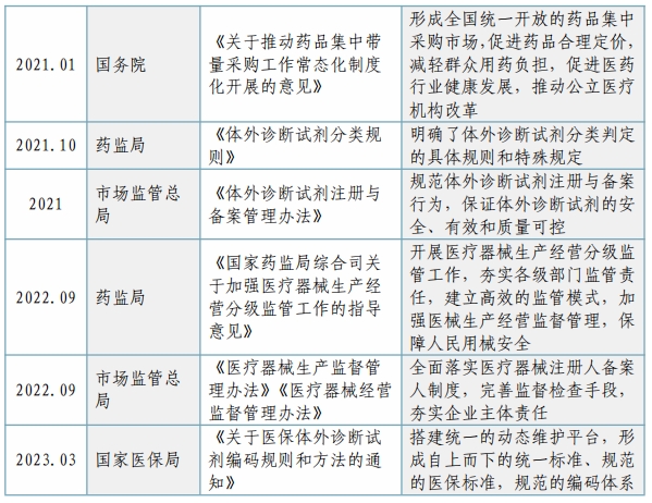 從2021年開始,國家陸續(xù)更新完善了醫(yī)療器械和體外診斷生產(chǎn)、監(jiān)管方面的法律法規(guī),頒布多項(xiàng)政策支持體外診斷領(lǐng)域的發(fā)展,同時(shí)致力于推進(jìn)體外診斷領(lǐng)域的集采常態(tài)化。2023年3月,國家醫(yī)療保障局出臺(tái)了針對(duì)體外診斷試劑編碼的規(guī)則辦法,標(biāo)志著我國體外診斷市場(chǎng)向規(guī)范化發(fā)展。多項(xiàng)利好政策和供給端的激烈競(jìng)爭(zhēng)將推動(dòng)國內(nèi)IVD廠商加大研發(fā)力度,在集采政策下積極布局國際市場(chǎng)和非公立醫(yī)院等新市場(chǎng),開發(fā)新產(chǎn)品,從內(nèi)部刺激企業(yè)自主創(chuàng)新,驅(qū)動(dòng)IVD市場(chǎng)發(fā)展。