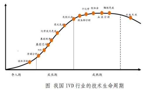 我國IVD技術(shù)經(jīng)歷了傳統(tǒng)化學(xué)反應(yīng)、酶催化反應(yīng)、免疫診斷和分子診斷的發(fā)展歷程,逐步向靈敏度高、特異性強(qiáng)、檢測(cè)速度快和低成本的方向迅速發(fā)展。目前放射免疫處于衰退期,化學(xué)發(fā)光免疫、分子診斷相關(guān)的基因測(cè)序、基因芯片、PCR則處于成長(zhǎng)期,建議在具備高成長(zhǎng)性的細(xì)分領(lǐng)域內(nèi)尋找投資機(jī)會(huì)。